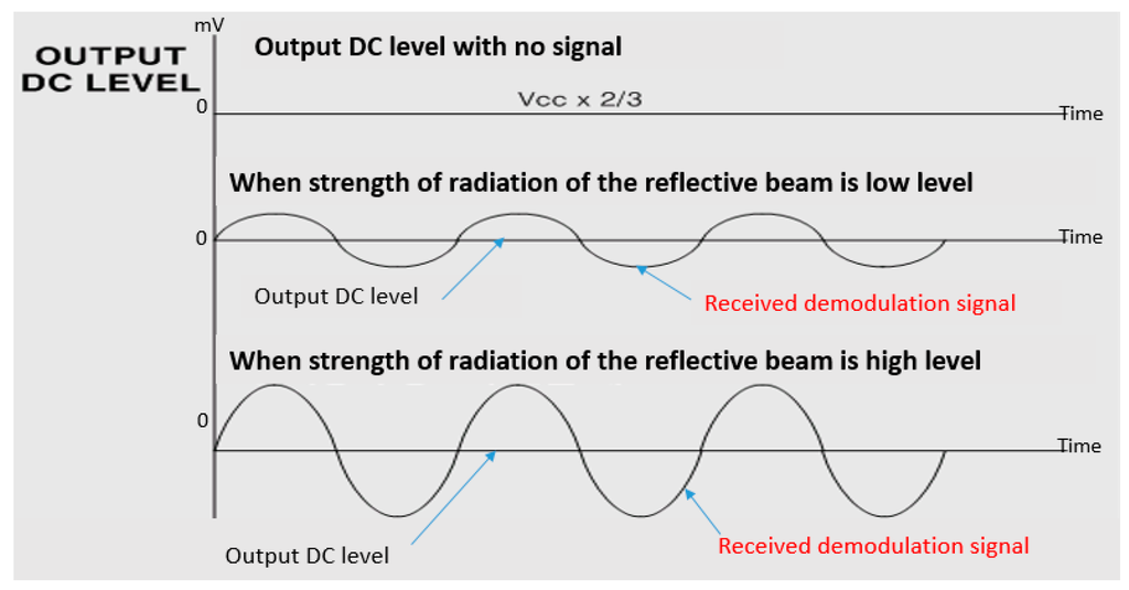 DC-offset output voltage shown as: (a) DC 3.3 V; (b) DC 3.1 V; and (c) DC 2.5 V, respectively, for when the strength of radiation of reflective laser beam are: (a) none; (b) weak; and (c) strong.