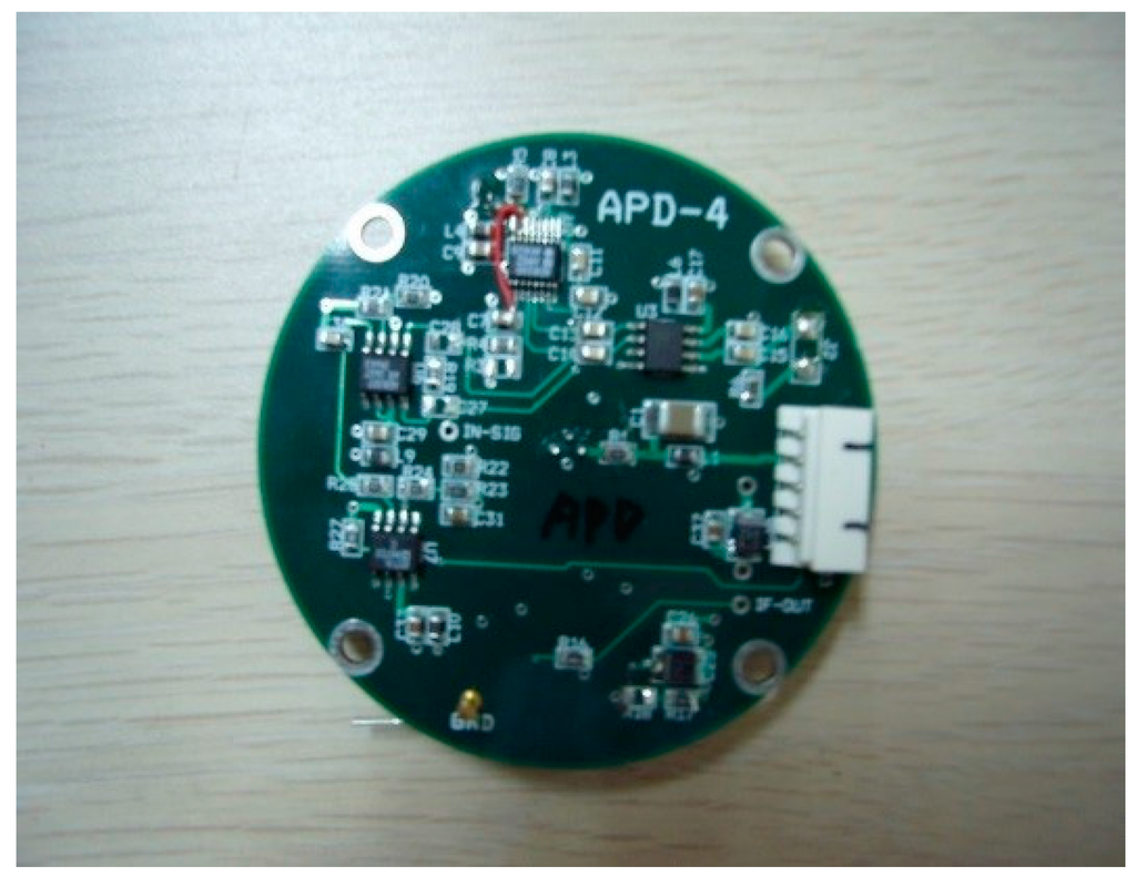- Dupuy, D.; Lescure, M.; Hélène, T.B. Analysis of an avalanche photodiode used as an optoelectronic mixer for a frequency modulated continuous wave laser range finder. J. Opt. A Pure Appl. Opt. 2002, 4, S332–S336. [Google Scholar] [CrossRef]