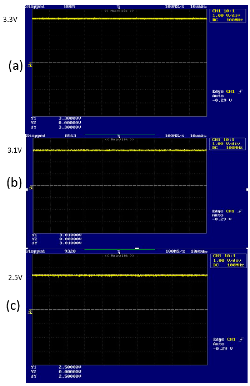 Figure 9 represents the output-voltage level that is acquired through the implemented circuit for measuring the strength of radiation of reflective laser beam (Figure 8). Figure 9 shows the DC offset voltage of the drain that as (Figure 9a) DC 3.3 V, (Figure 9b) DC 3.1 V and (Figure 9c) DC 2.5 V when there is (a) none, (b) weak and (c) strong strengths of radiation of reflective laser beam.