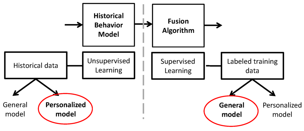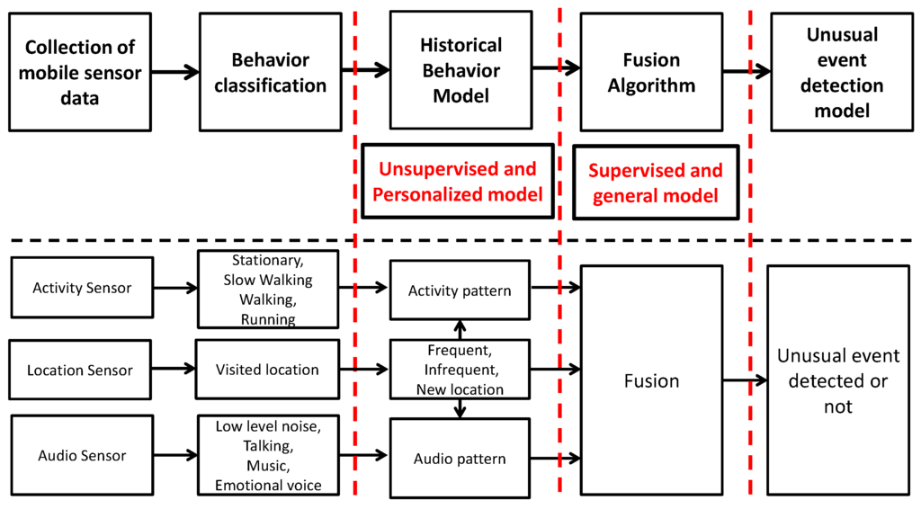 Figure 2 zooms in on the two critical classification stages of Figure 1 and summarizes the combined decision-making process of our hybrid fusion design for the myBlackBox system. We now see that the pattern recognition and fusion algorithm steps comprise the unsupervised learning stage and supervised learning stage, respectively. In the pattern recognition stage, which is based on cumulative historical user data, we chose a personalized model over a general model because we needed to measure individual users’ behavior patterns over time as accurately as possible. If we had chosen a general model, it would not have been as sensitive to each individual’s unique daily behavior patterns. For example, for this unsupervised learning algorithm, we measured the probability of each individual’s 30-min segments of personalized behavior pattern data as to whether these fell within their user-specific historical normal range of cumulatively-measured daily behavior patterns. In the fusion stage, which is our supervised learning algorithm that uses labeled training data (user subjects’ feedback on our classification algorithms), we determined that developing a general unusual event model based on generic users’ labeled data achieves basically commensurate accuracy in our system compared to a personalized model.