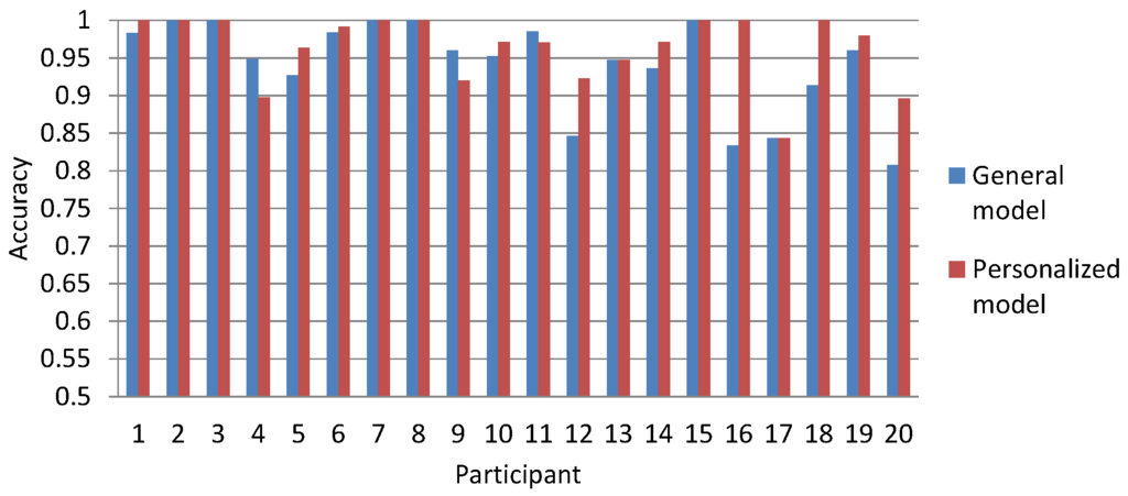 Overall, we found the average personalized model-based accuracy of 0.96 to be slightly better than the average of the general model-based accuracy (0.94), by 0.02 points. Although for the personalized model, the accuracy measurements were higher for 50% of the users (10 of them); the accuracy measurements yielded using the general model were higher (15%) or the same (35%) for the remaining users; as shown in Figure 3. Although the accuracy of the general model was a little lower than that of the personalized model, we noted that its accuracy was sufficiently high enough and comparably enough in performance across all users to be confident in adopting it for our research purposes. For these reasons, we adopted the general fusion model for building our myBlackBox system and for making it more scalable and usable for users of our system.