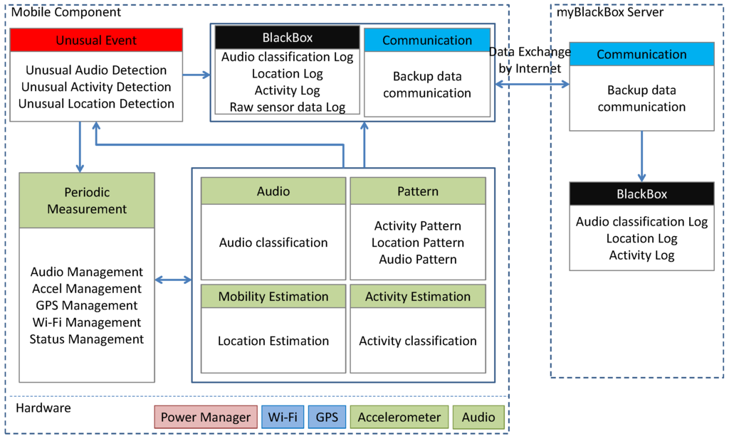Mobile component: This component runs on the user’s smartphone. The mobile component implements two important functions. First, it implements an unusual event detection system that automatically fuses the phone’s sensors’ measurements in order to detect any unusual events experienced by the user. Second, it implements blackbox functionality to record all sensor measurements that are stored locally as clues and evidence on the phone. This information is then automatically sent also to the myBlackBox server in the cloud.