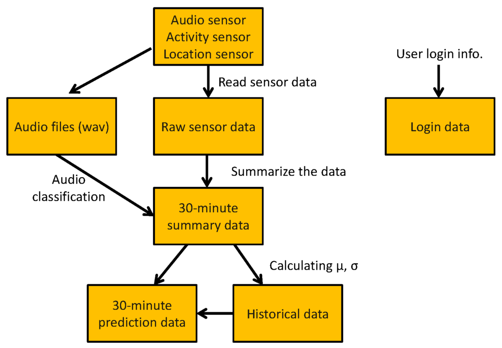 The myBlackBox application reads sensor data from the mobile phone in order to identify both usual and unusual mobile user events. The mobile application continuously activates the accelerometer sensor to measure a user’s activity and periodically activates the audio sensor every 5 min to record audio data as a wav file for 15-s periods. After collecting the audio data, it analyzes the audio file with the MFCC and GMM algorithms and classifies the audio as numeric data (e.g., (1) quiet sound; (2) talking; (3) music; (4) loud sound). It also records the users’ location with either Wi-Fi, every 3 min, or with the GPS sensor every 5 min, when Wi-Fi is not available. We determined that our mobile application on the smartphone cannot share the audio sensor capabilities simultaneously with other mobile applications (e.g., phone calling, game playing, Skype, etc.). Whenever our myBlackBox application is activating the audio sensor, other applications (such as phone calling) cannot utilize the audio sensor. Because of this issue, we decided it would be best not to conflict with any possible audio sensor use of the myBlackBox research participants who were using our system. Thus, we did not activate the audio sensor whenever the mobile user was interacting with their phone in any way: e.g., turning on the screen (e.g., to surf the web, text, etc.) or calling. Using the methods described above, our application continually collects 30-min segments of a mobile user’s location, activity and audio sensor data on the mobile phone and then, with the 95% Confidence Interval (CI), determines whether the user is experiencing an unusual or normal daily event.