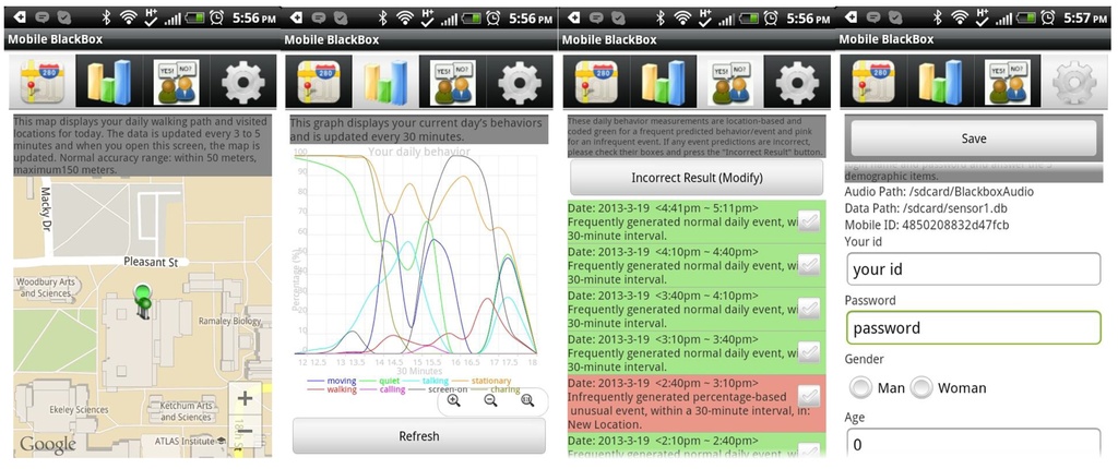 The myBlackBox mobile application [31] consists of four screens available to the users. Figure 6 shows these four screen shots of the myBlackBox application. The first three screens display the user’s current behavior data. Screen 1 shows the user’s daily map of locations visited during the most recent period. The screen displays up to 100 data points, and the data are updated every 3 to 5 min. Screen 2 shows the user’s behavior patterns for a 24-h period. The daily behaviors collected from each user are based on percentages of occurrences of different user activities logged in a 30-min period. Data were collected from the users’ audio, location, movement activity, etc., measured by the sensors on the phone. This second screen is also scrollable, from the first to the last hour of the current day, and it was refreshed at midnight of each day. The third screen shows summary results of each 30-min segment of users’ behavior data, with our system’s daily event prediction of whether this 30-min period constituted a normal event or an unusual event in the user’s daily schedule. The fourth screen was used initially to collect users’ login information for accessing our web server and summaries of their historical behavior data. We also collected non-mandatory background information on this screen from users who were willing to provide it, on: gender, profession and age. Users only needed to provide a login and password on this screen if they wished to access their historical data on our web server.