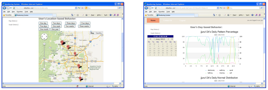 For the myBlackBox server, we built two components: a collection and a web component. We installed our system and a database in a cloud server in our laboratory. We have assigned 2 GHz 1 CPU, 2 GB memory and 10 GB HDD for our system server. The collection component of the server retrieves and logs sensor data from users’ mobile phones. It also stores the summary data, processed on the phone, using the sensor and prediction data, which is analyzed every 30 min on each smartphone. The mobile application then compiles these summary data as an XML-based Json file and then sends it to the collection component of the server. The server receives the Json data using the Spring Roo framework [32] and stores it in a MongoDB [33] database, as shown in Figure 7. The web component [34] of the myBlackbox server accesses the MongoDB and processes the data in order to display the users’ location and activity data as a geographical map and line graph, respectively. The mobile users can then view up to a month’s worth of historical record data, summarizing their personal behavior patterns, which include a map of visited locations, activity and audio patterns and mobile phone status, as shown in Figure 8.