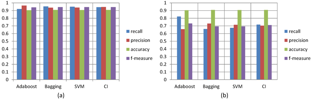 Figure 9a shows the precision, recall, accuracy and f-measure (combined recall and precision) performance measurements of the four classification algorithms when using them to detect normal events. We found that the best algorithm of the four fusion classifications for detecting normal events was the Bagging algorithm, with the combined performance measurements the highest of any of the other three algorithms: 0.95 recall, 0.93 precision, 0.95 f-measure and 0.91 accuracy measurements. The least proficient performing algorithm of the four was the AdaBoost algorithm, with a 0.91 recall, 0.96 precision, 0.94 f-measure and 0.90 accuracy measurement.