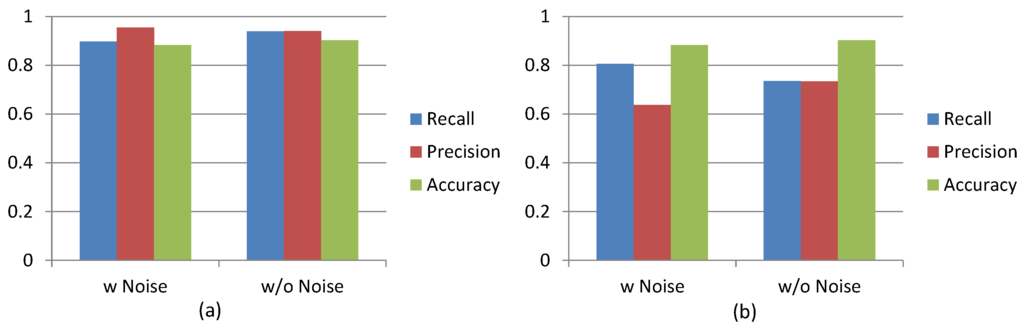 We investigated three accuracy measurements, accuracy, precision and recall, for detecting unusual events of mobile users’ daily behavior patterns, when the 15 participants of our study carried their mobile phone for a period of one month. We analyzed and compared the measurements in two instances: (1) using the original collected data; and (2) after identifying and removing “noise” data (e.g., phone calling, game playing, charging). Figure 10a shows the averaged measurements, across the 15 mobile user participants, for the precision, recall and accuracy probabilities of correctly detecting normal events, using the CI. By removing noise data for this scenario also, we also improved the overall accuracy and recall measurements by reducing the percentage of false-negatives for predicting normal events. Figure 10b also shows that our method of removing noise data from unusual event detection measurements was successful. When we analyzed the original raw data of the 15 mobile users, we found the average accuracy measurement to be 0.88, but after removing the noise data, the accuracy increased to 0.90. This method, of removing the noise data, also improved the average precision measurement by decreasing false-positives that indicated unusual events, when their were none.