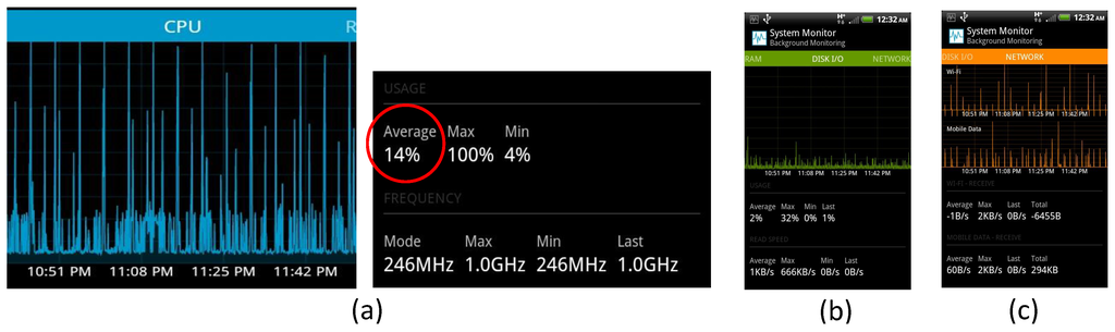 - System Monitor. Available online: https://play.google.com/store/apps/details?id=com.cgollner.systemmonitor (accessed on 17 May 2016).