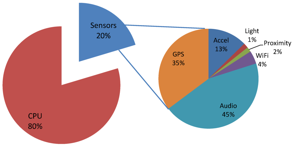 To study the energy usage of the mobile myBlackBox application, we measured battery lifetime and found that the battery consistently lasted for about 13 h when running the entire application. To analyze how much battery power is used by the CPU and sensors of the mobile phone when running our application, we measured the battery usage of our mobile application using the Power Tutor [37] application and Power Profiles for Android [38], which can log the battery usage of mobile phones, provide battery usage statistics and show sensors’ power usage on the smartphone. Figure 12 shows both the overall CPU versus sensor mobile battery usage and the individual sensor battery usage (i.e., GPS, Wi-Fi, audio, accelerometer, proximity, light) on the smartphone. Twenty percent of the battery usage was related to the mobile sensors, and the remaining 80% of the battery usage was utilized by the CPU. The 80% CPU battery power usage is necessarily high because our application works continually as a background service at all times to collect, measure and classify the various types of sensor data. In the future, we plan to further enhance our application’s design to conserve more CPU usage, so that the mobile device’s battery will last longer than 13 h.