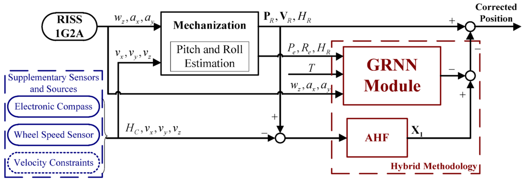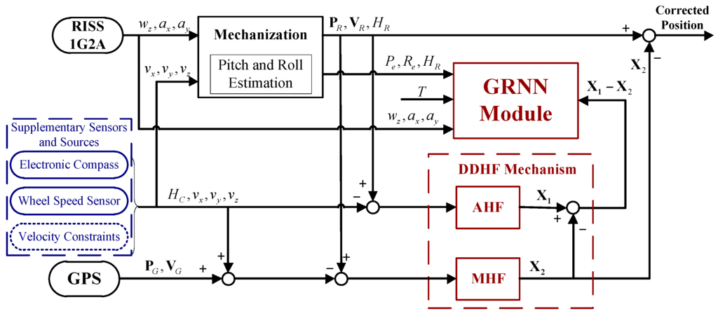 When GPS is available, the state vector of the MHF X2 can easily be obtained and provides precise corrections to compensate for RISS errors. Meanwhile, the state vector of the AHF X1 is updated synchronously with X2. Their difference X1-X2 is the important training data of the GRNN module. Due to the centralized measurement update of GPS measurements and the observations provided by supplementary sensors and sources, the unavailability of GPS measurements leads to the invalidation of MHF during GPS outages. However, X1 can still update because the observations of AHF are immune to GPS signal blockages. The AHF ensures that the positioning system can still benefit from the measurement update associated with the supplementary sensors and sources during GPS outages. Besides, owing to the inherent properties of H∞ filter, the proposed positioning system is immune to the uncertain nonlinear drift. Thus, the beneficial effects of the DDHF are addressing the uncertain nonlinear drift of MEMS-RISS and making full use of the supplementary sensors and sources.