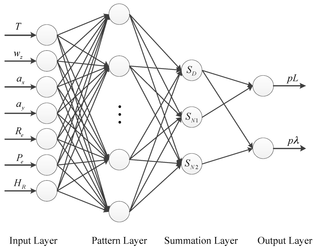 The schematic diagram of the designed GRNN architecture is shown in Figure 3, which consists of four layers: the input layer, the pattern layer, the summation layer, and the output layer [43,44]. They are explained in detail as follows: