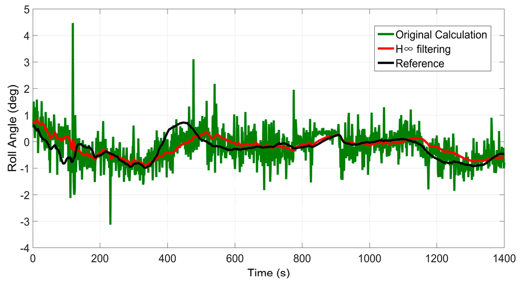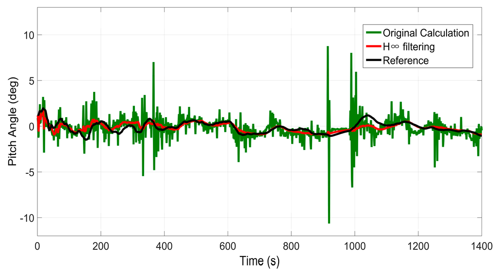 Besides, wz, ax, and ay can be obtained from RISS. Since MEMS-RISS is utilized in this paper, the uncertain nonlinear drift of MEMS-RISS will cause large errors in pitch and roll angle calculations. As discussed in Section 1, the H∞ filter is essentially immune to uncertain nonlinear drift. Thus, it can be used to eliminate the negative effect of uncertain nonlinear drift in pitch and roll angle estimation.