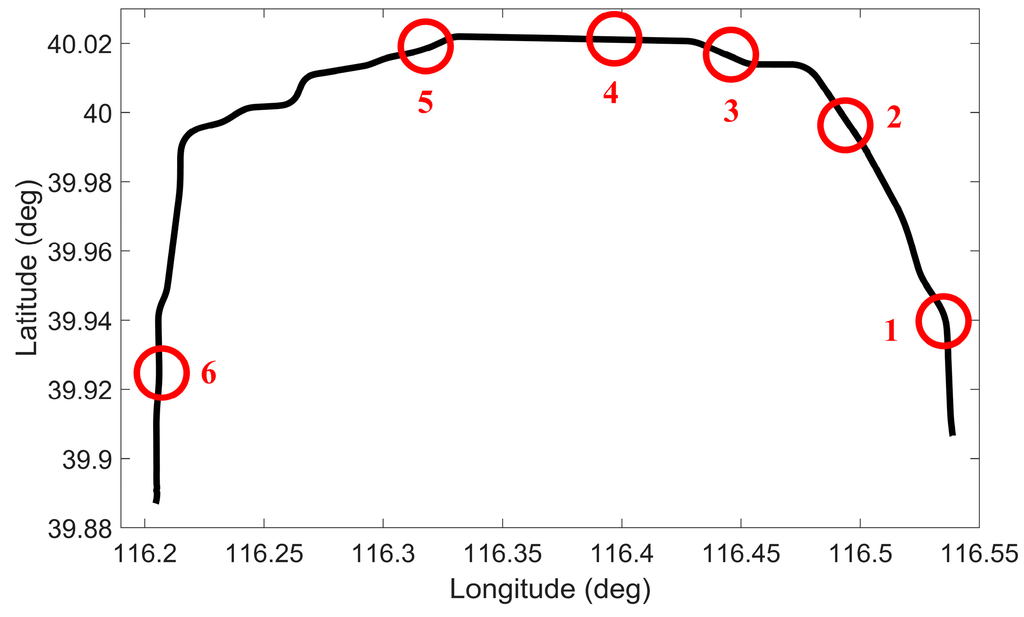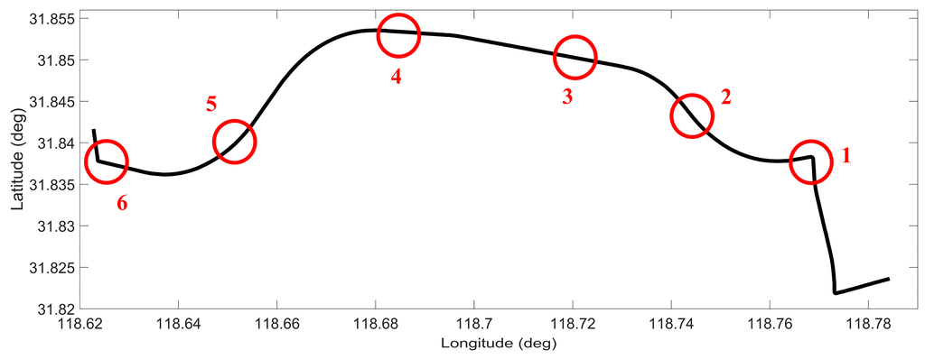 To further validate the performance of the proposed solution, trajectory 2 in urban area with real GPS outages was used for this purpose. This trajectory was carried out on the Fifth Ring Road in Beijing, China. The road test was performed for nearly 40 min and a distance of around 48 km. Although there were no traffic lights on the Fifth Ring Road, frequent driving maneuvers such as lane-changes and sudden accelerations/decelerations were conducted due to the typical crowded urban road. During the whole test, real GPS outages were caused by overpasses, trees, and road infrastructure. Since some periods of real GPS outages were shorter than 50 s, the selected outages were all extended to 50 s for convenient comparison. Straight portions and curves were also considered when selecting outages in this trajectory, as shown in Figure 13.