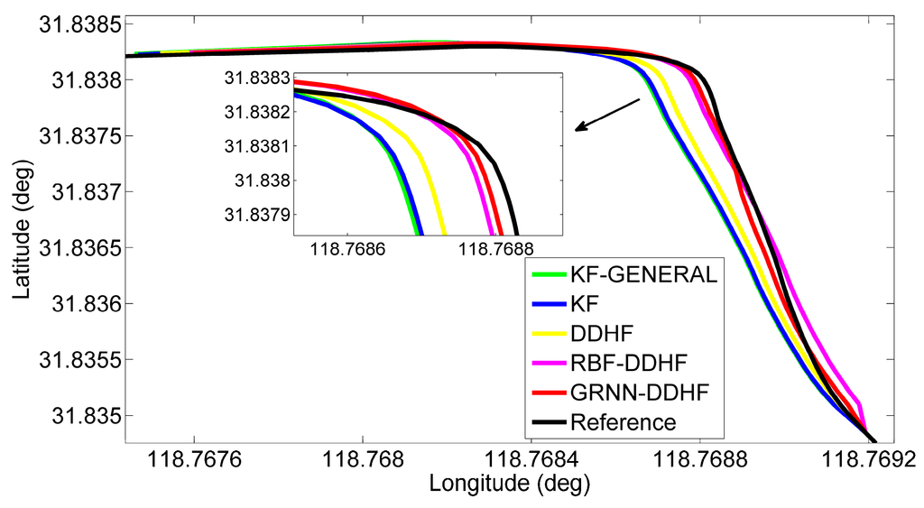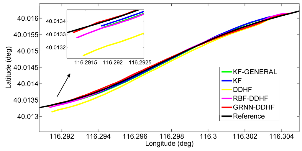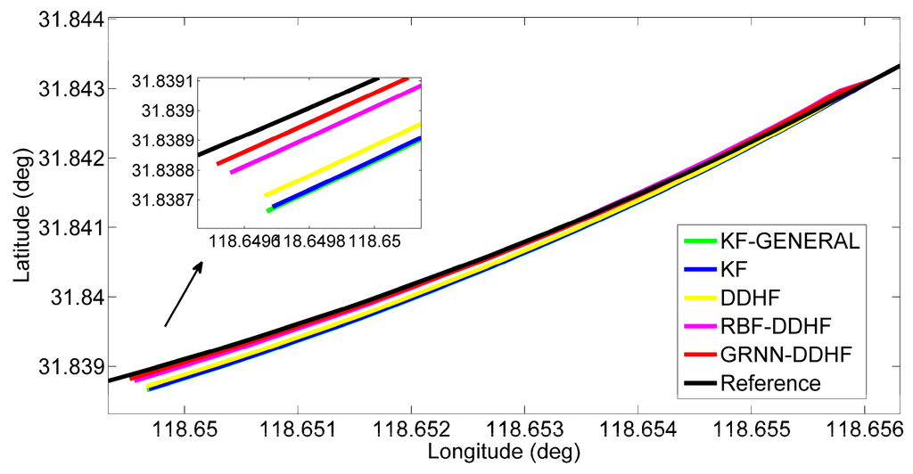 The results from Table 6 and Table 7 confirm the results of the previous trajectory. Comparing the GRNN-DDHF solution and RBF-DDHF solution with the other three solutions, the superiority of ANN models is clear. Again, the KF solution outperforms the KF-GENERAL solution because of the estimation of pitch and roll angle rather than without. Comparing the DDHF solution with the KF solution, the general advantages of the H∞ filter are further validated.