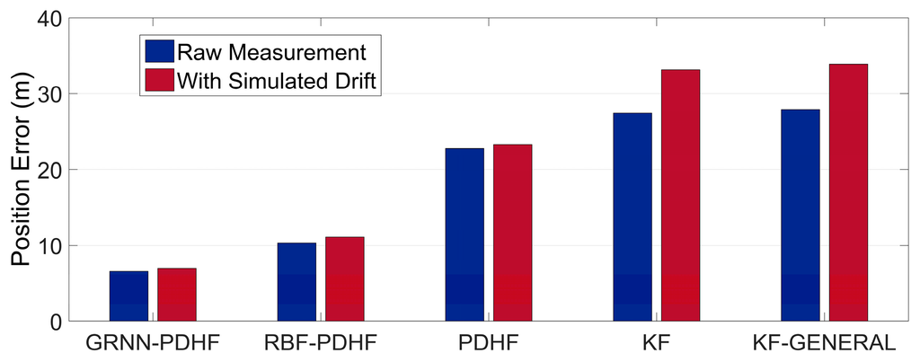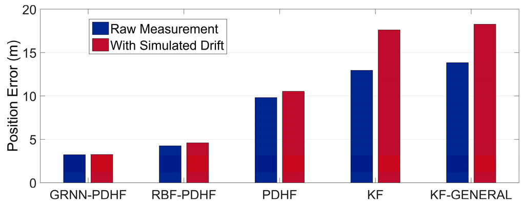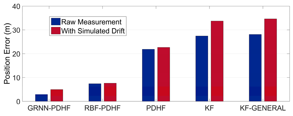 In the last few years, artificial neural network (ANN) approaches, such as the Radial Basis Function (RBF) neural networks [28,29,30] and the Adaptive Neuron-Fuzzy Inference System (ANFIS) [8,31], have been developed to enhance GPS/INS integration for its improved ability to handle the problem of lacking systemized set of functions that can correctly characterize the relationship between inputs and outputs. Usually, the inputs of ANN models are INS and/or IMU measurements, while the outputs are INS position errors. However, the uncertain nonlinear drift in MEMS inertial sensor measurement increases the nonlinear complexity of the inputs/outputs functional relationship being modeled. This will be a challenge to the nonlinear processing ability of ANN models. A generalized regression neural network (GRNN) has strong advantages in approximation capability compared with RBF neural network. This paper also demonstrates the potential of a GRNN in vehicle positioning.