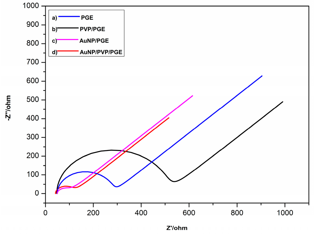 AuNP/PVP-modified PGE surfaces were investigated using an electrochemical method and scanning electron microscopy. EIS was used as an electrochemical methods (Figure 1).