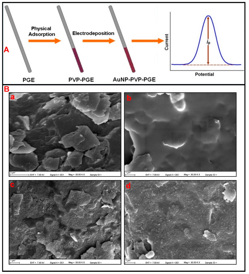 Figure 2. (A) Schematic presentation of the work; (B) scanning electron microscopy (SEM) images of (a) PGE; (b) PVP/PGE; (c) AuNP/PGE; (d) AuNP/PVP/PGE.