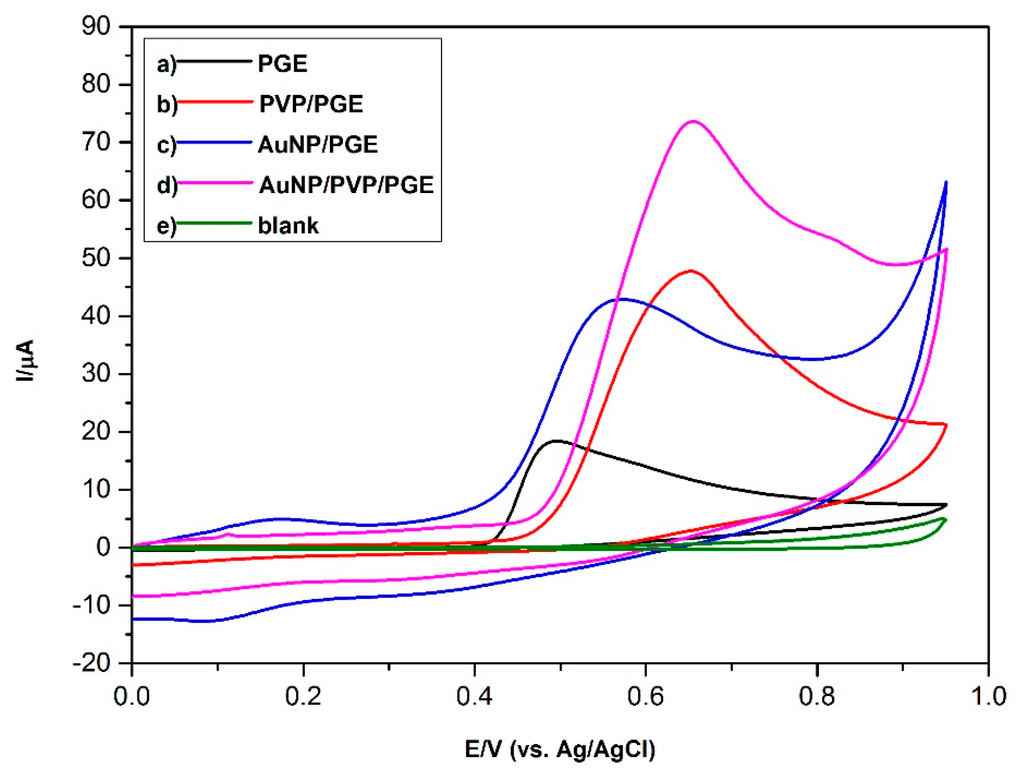 Figure 3. Cyclic voltammograms of 0.1 mM Bisphenol A (BPA) at: (a) bare PGE; (b) PVP-modified PGE; (c) AuNP-modified PGE; (d) AuNP/PVP-modified PGE; (e) absence of BPA at bare PGE. Conditions: pH: 7.0 (0.1 M Phosphate buffer solution (PBS)); scan rate: 100 mV/s−1; Einitial (Ei): 0.00 V; Efinal (Ef): 0.95 V.