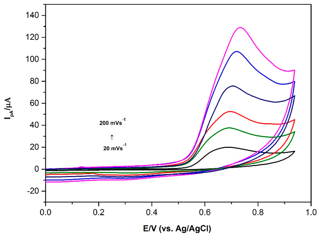 Scan rate study was carried out in a range of 20–200 mVs−1 (Figure 4). The solution contained 0.1 mM BPA and has a pH of 7 with PBS. The relation between the anodic peak current and the scan rate can be expressed as follows (Equation (1)),
