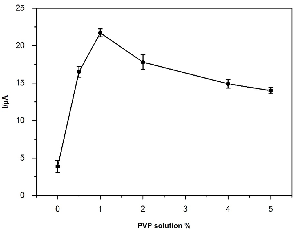 PVP (0.5%–5%) solutions with various concentrations were prepared with deionized water and the effect of the PVP concentration on BPA oxidation peak current was examined. The results were shown in Figure 5 and, as can be seen from this figure, the solution with 1% PVP gave the best response. After this point, BPA oxidation peak was decreased considerably. It was determined that when the PVP amount is over 1%, the adsorption capacity of the surface for BPA deposition is too much for the stripping of BPA. Therefore, solution with 1% PVP was chosen as the optimum PVP consideration.