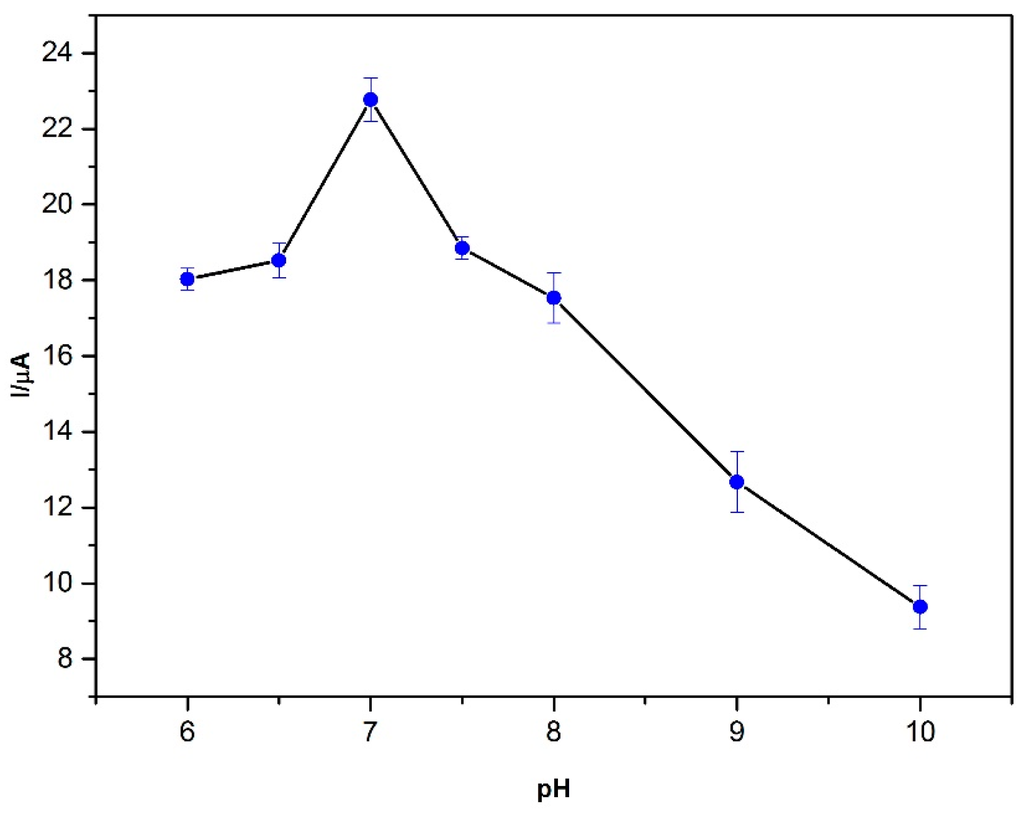 Figure 6. Effects of pH value on the current response of 5 μM BPA. Conditions: pH 7.0; frequency: 50 Hz; step amplitude: 40 mV; pulse amplitude: 5 mV; Edep: −0.2 V; tdep: 60 s.