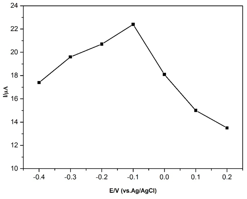 Stripping analysis has two steps, preconcentrating and then stripping. In the preconcentrating step, constant potential was applied for a certain time under stirring. The accumulation time and accumulation potential are too important for the sensitive determination, so these two parameters were investigated and results are shown in Figure 8. The effect of the accumulation potential was examined over the potential range −0.40 to 0.20 V (vs. Ag/AgCl) (Figure 8). As shown in Figure 8, the oxidation peak current increased sharply with the changing potential from 0.20 to −0.10 V (vs. Ag/AgCl). The oxidation peak current significantly decreased at more negative potential than −0.10 V (vs. Ag/AgCl). So, −0.10 V was chosen as the optimum accumulation potential in the following measurements.