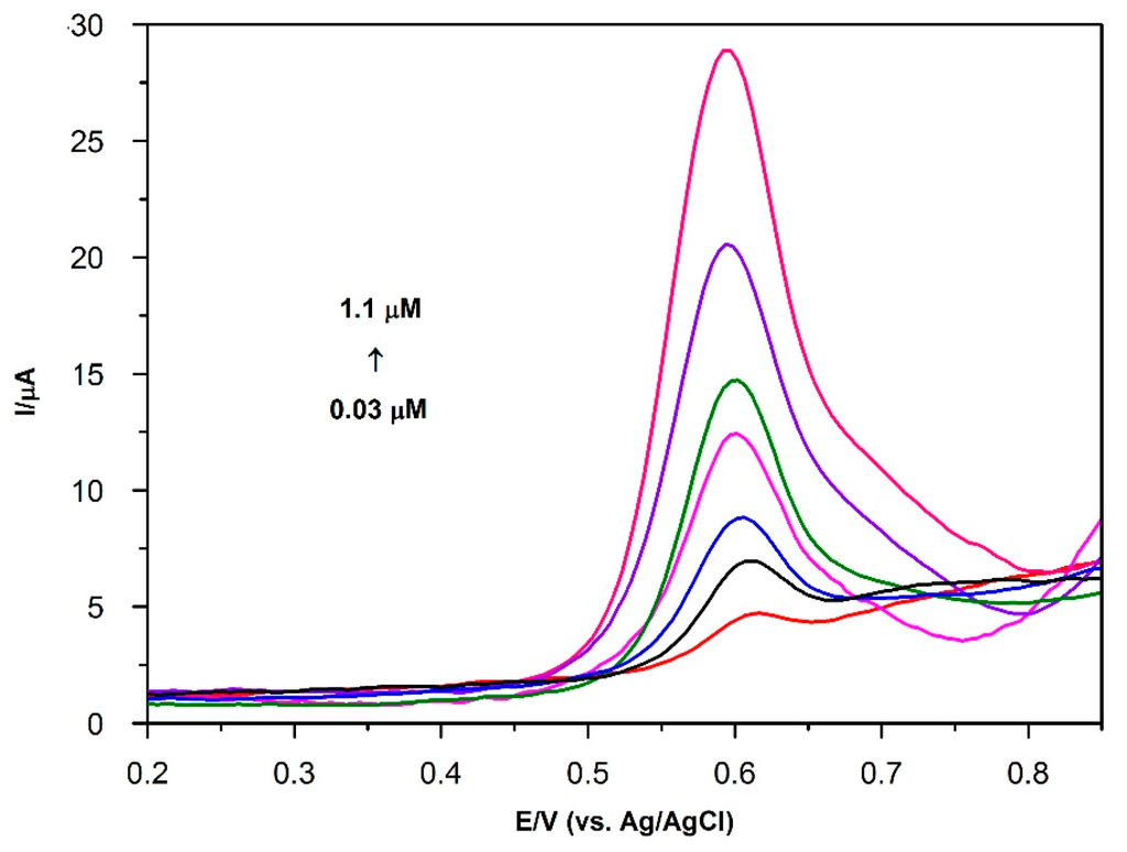 The calibration curve was obtained for the determination of BPA under optimum experimental conditions. It is given in Figure 9. This curve was derived from the SWAdSV data obtained with AuNP/PVP/PGE surface. The calibration plot of peak current vs. concentration was found to be linear over the range of 0.03 μM to 1.1 μM. This linearity is given by the equation given below (Equation (5)):