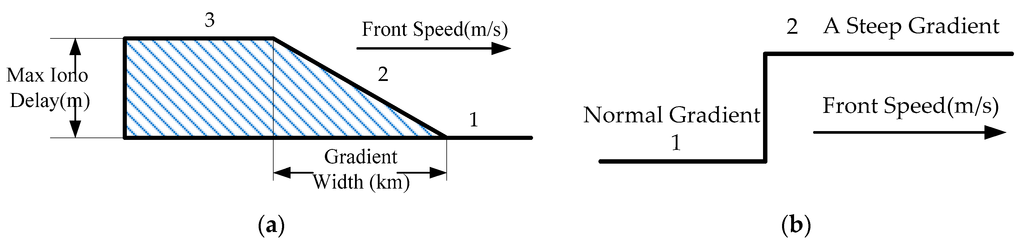 For GBAS, the ionospheric anomaly model can always be modeled as a steep traveling wave-front between regions of low (i.e., 3) and high (i.e., 1) ionospheric delay depending on a large amount of GPS data, as shown in Figure 1 [15]. The wave-front is described as a piecewise linear curve by three parameters: max ionospheric delay, front speed and gradient width. Figure 1a shows a linear change in 2 between 1 and 3. The steady accumulated error of single frequency carrier smoothing will be much larger if a steep gradient in the ionospheric is delayed; in this case, a huge degradation of accuracy would happen [17]. Therefore, we focus on the ionospheric gradient anomaly, which is a dominant threat for GBAS, rather than the ionospheric delays’ anomaly. The ionospheric gradient anomaly model in Figure 1b can be derived from Figure 1a.
