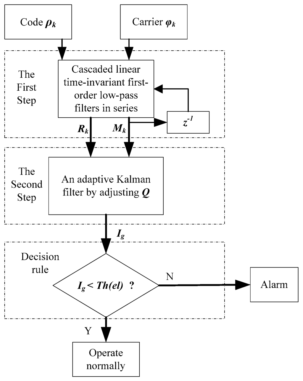 where Ts is the sample time and Ig represents the ionospheric gradient. With the use of Equation (4), it can be found that the difference of the adjacent epoch CMC includes the double ionospheric gradient and multipath receiver noise. The noise greatly affects the estimation accuracy of the ionospheric gradient, when it is much bigger. Therefore, the traditional CCD methods normally use the linear time-invariant low-pass method to estimate the ionospheric gradient by suppressing the high frequency noise. The test statistic of CCD-1OF is expressed as [22],