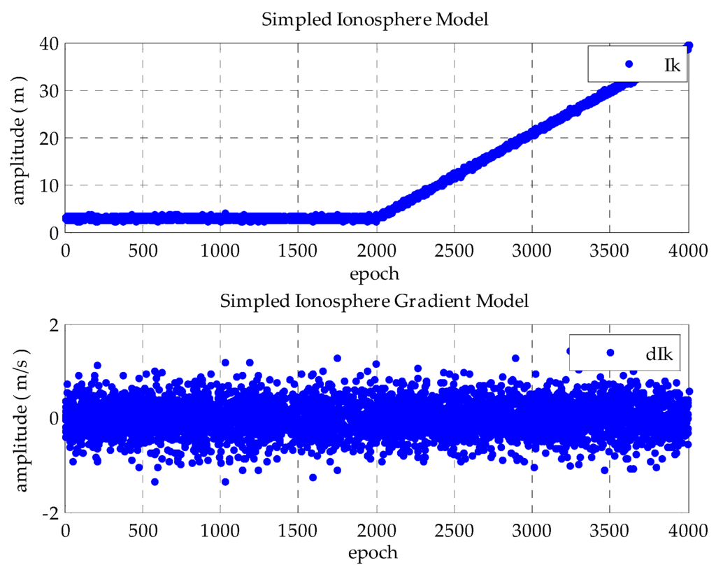 where n represents the white Gaussian noise and k represents the k-th epoch. When n ~ N (0, 0.25), the simple ionosphere model and simple ionospheric gradient model are shown in Figure 3, where the first 2000 epochs are ionospheric gradient-free cases; the others are ionospheric gradient anomaly cases.