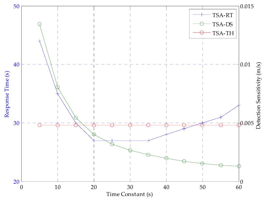 In order to detect the ionospheric gradient at a rate of 0.018, the decision about the time constant is very important in the first step of TSA. Taking both detection sensitivity and response time into consideration, the time constant is chosen when the performance of TSA is superior to CCD-2OF, with the recommended time constants. Therefore, 20 s is the better choice as the time constant of TSA when nk ~ N (0, 0.25), as shown in Figure 4, where: the green line is the detection sensitivity (DS) of TSA with corresponding time constants; the red line is the threshold value (TH) of the detection of the sensitivity of TSA decided by CCD-2OF with 30 s; the blue line represents the response time (RT) to the anomaly of TSA. When the standard deviation of nk is changed, the approximate time constant will be chosen from 100 Monte Carlo simulations. The time constants of 20 s, 30 s, 45 s, 50 s and 55 s are mapped to the noise with standard deviations of 0.25, 0.5, 1.5 and 2, respectively. This shows that the larger the standard deviation of noise is, the larger the time constant of TSA is chosen.