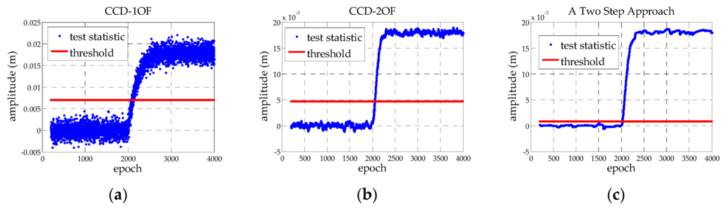 To compare the simulated gradient detection performance, the test statistics are constructed by CCD-1OF using τd1 = 200 s from Equation (5), CCD-2OF using τd1 = τd2 = 30 s from Equations (5) and (6) [5] and the TSA using τTSA1 = τTSA2 = 20 s, when nk ~ N (0, 0.25), shown in Table 1. The thresholds for the three methods are determined by Equation (7), where Kffd is chosen from the required probability of false alarms [28]. The inflation factor is determined as 1, because the noise obeys a Gaussian distribution. In order to obtain the thresholds in normal conditions, which are mentioned in MOPS, the thresholds are calculated from the 200th sample, ending with the 2000th sample. Figure 5 represent the test statistics and the thresholds of CCD-1OF, CCD-2OF and TSA, respectively. Through the comparison of the three methods, the response time to anomaly, detection sensitivity and the standard deviation are: 84, 32, 28; 0.0071, 0.0047, 0.0023; and 0.0012237, 0.00081983, 0.00041461, respectively. The results show that the TSA has higher detection sensitivity and a faster response time to anomaly.