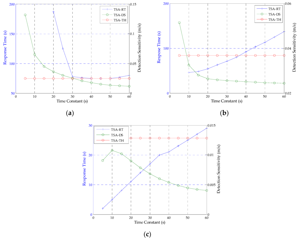 (a–c) The relationship of TSA between the time constant and response time, detection sensitivity, when 0 < ele ≤ 30, 30 < ele ≤ 50, 50 < ele ≤ 90, respectively.
