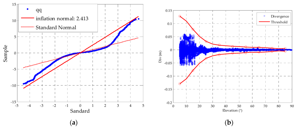 (a) Quantile-quantile plot for the inflation factor; (b) distribution of the test statistics with respect to satellite elevations and the resultant thresholds.