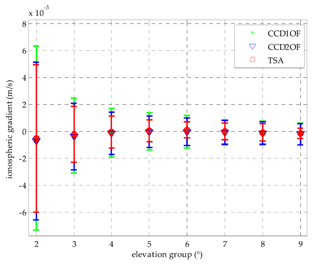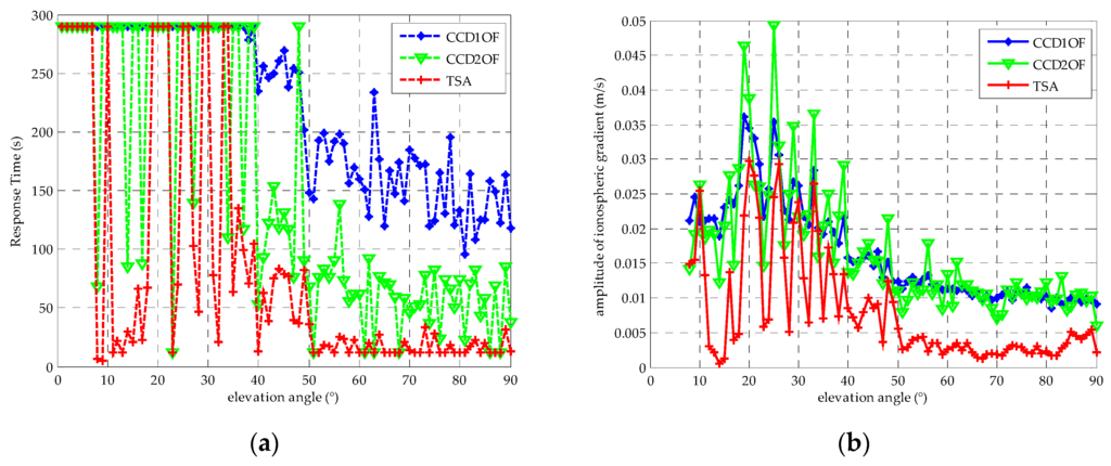 Furthermore, the detection sensitivity is compared between TSA and the traditional CCD methods for PRN19 in Figure 9b. The result shows that the TSA has higher detection sensitivity than the traditional CCD methods. In general, with the increasing of elevation angle, we will get a smaller detection threshold. Once the ionospheric gradient is smaller than the detection threshold of the corresponding elevation bin, we cannot detect the anomaly, as shown in Figure 9a.