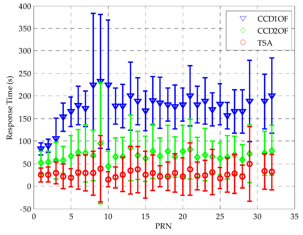 Finally, we compare the mean and standard deviation of the response time to anomaly with respect to all of the satellites visible when the ionospheric gradient is at a rate of 0.018 m/s in each single elevation angle. The result shows that TSA has a quicker response to detect the CCD anomaly for all satellites visibly, as shown in Figure 10. The average response time to anomaly of TSA compared to CCD-1OF and CCD-2OF improves by 83.7% and 59.3%, respectively.