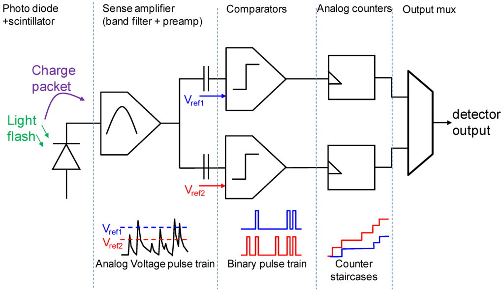 The pixel topology is shown in Figure 2. It is essentially a two-channel counting pixel. As transistor number and area is expensive, we had to reduce the complexity of each component to the minimum. The concept of the charge packet sense amplifier or “pulse shaper” is shown in Figure 3.