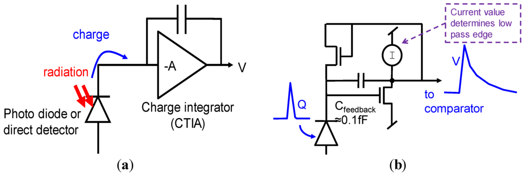(a): General concept of a charge sensitive “charge trans-impedance amplifier” (CTIA); (b): CTIA with resistive feedback implemented as a MOSFET, becoming a “pulse shaper.”