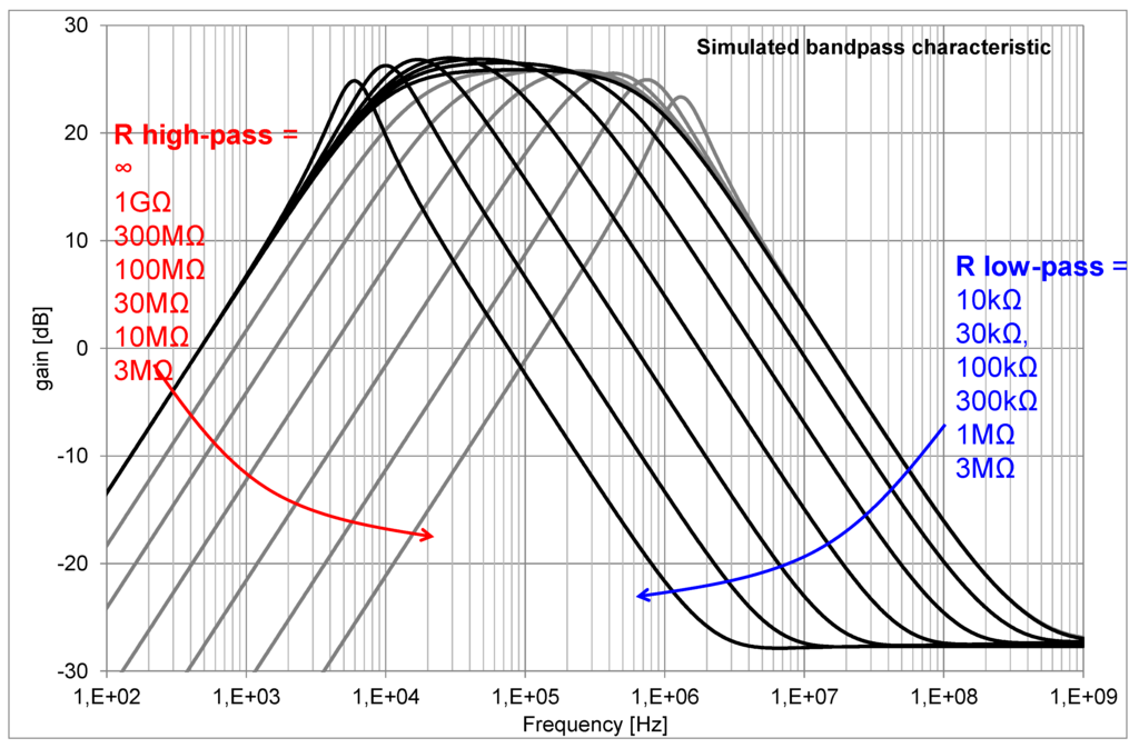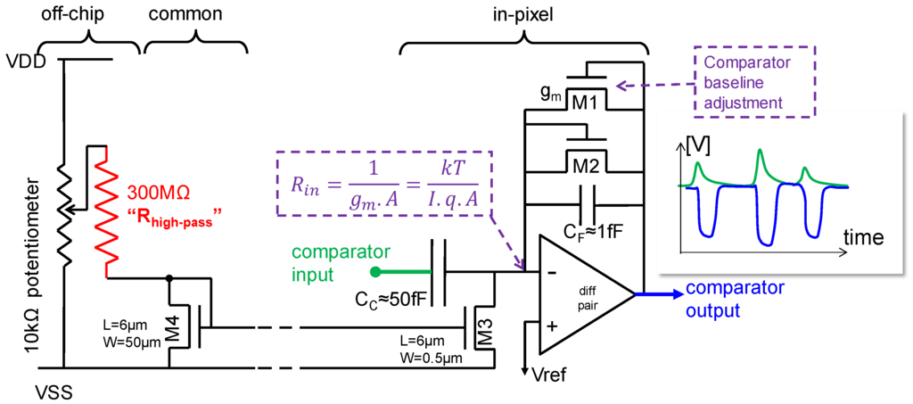 The comparator concept of this pixel is shown in Figure 4. The single pulse shaper feeds two comparators, each having different threshold “Vref.” Both the bias currents in the pulse shaper and comparators are set through current mirrors. By choosing a proper value for the off-chip bias resistors of these current mirrors, one can independently set the overall high pass and low pass edge of the band-pass characteristic of the combination pulse-shaper + comparator, as exemplified in Figure 5.