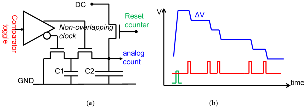 Analog domain counter. (a): circuit concept; (b): signals as expected on key nodes of the circuit concept.