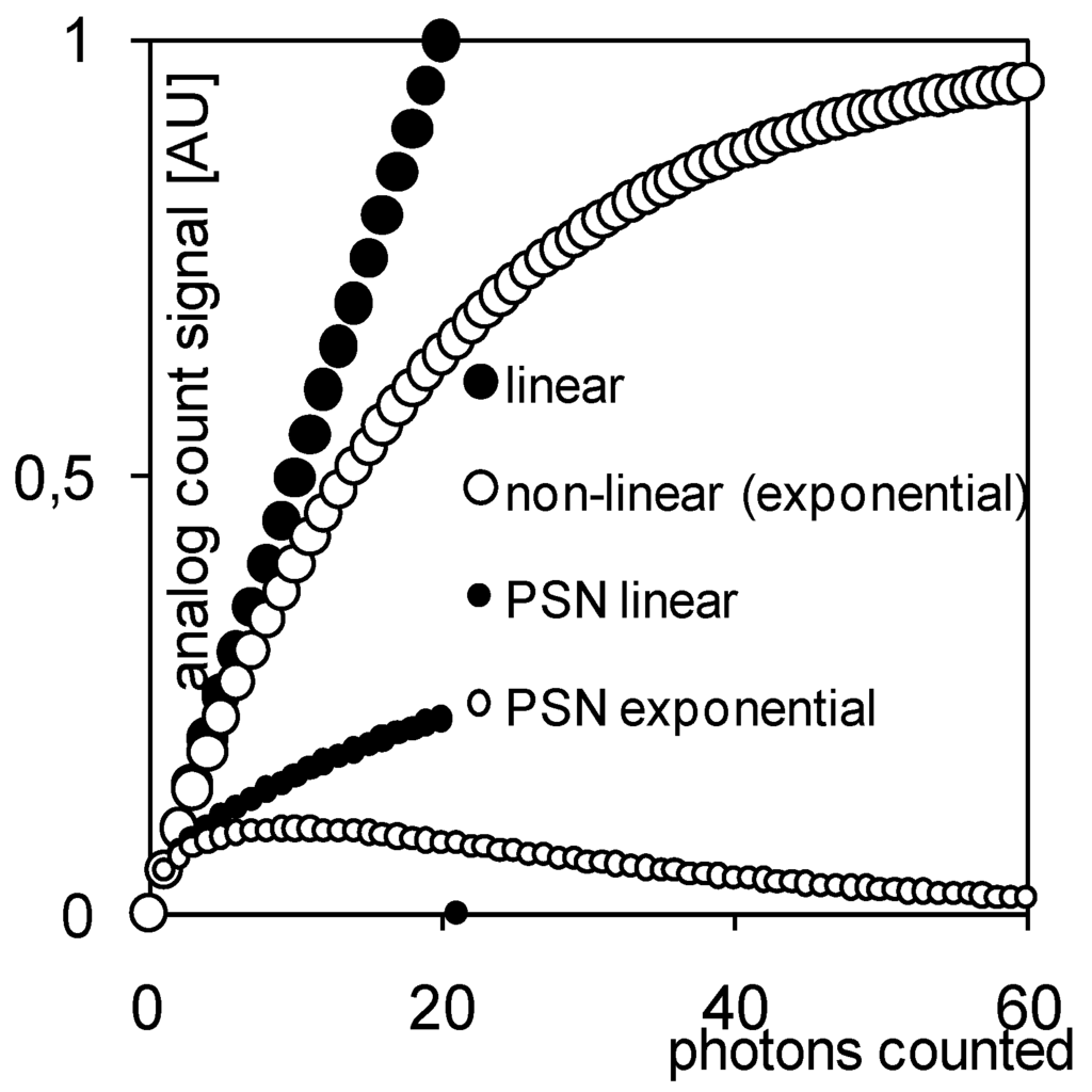 “Non-linear analog counting” is valid as long as the voltage step can be discriminated by the external ADC; yet this may be relaxed as long as the PSN (photon shot noise) expressed in voltage steps can be discriminated by the ADC. PSN is calculated as the square root of the number of photons counted.