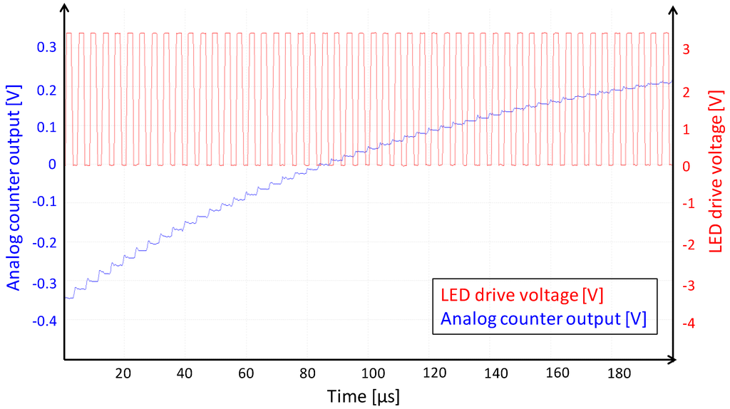 Signal of an analog counter during illumination of the QX2010 by a pulse train of LED pulses. X-axis: Time 0–1 ms; Y-axis: Red trace LED forward bias voltage; Blue trace analog counter voltage, measured real-time inside the circuit.