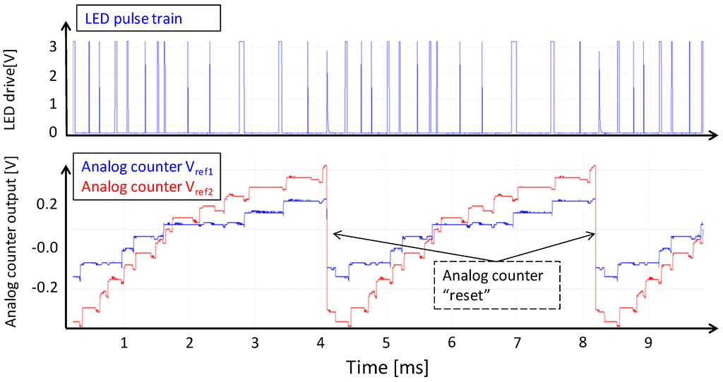 Demonstration of analog counting, emulating the variation of charge packet size by means of LED pulse width modulation. For the evaluation of noise and reproducibility, we defined a repeated random pattern of long and short LED pulses (blue top trace). The bottom traces are the two real-time observed analog counter outputs (with different Vref thresholds) of one pixel.