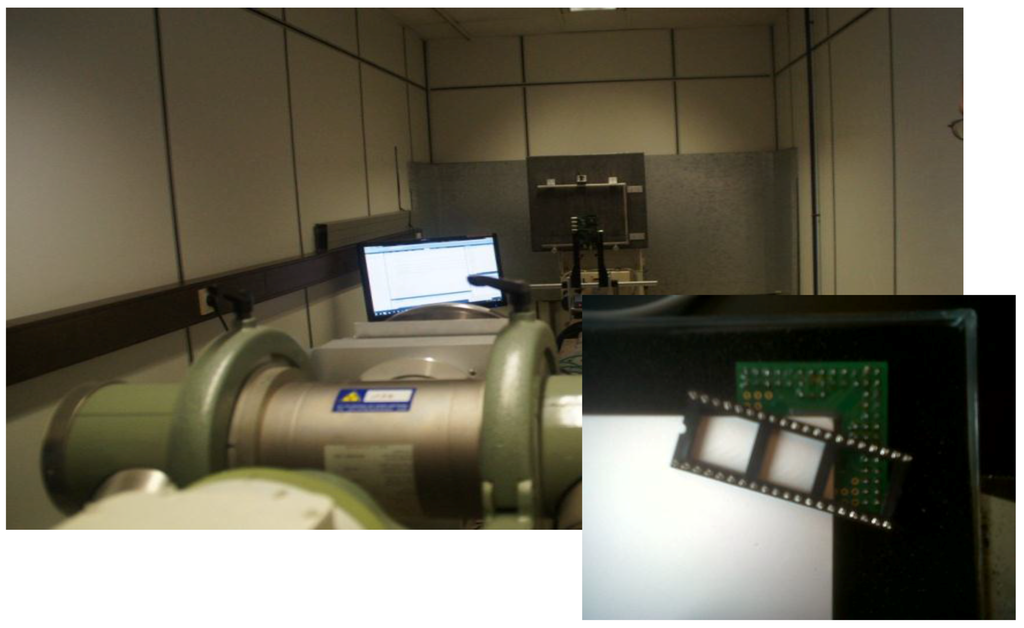 In this paragraph we report on the experimental results of the QX2010 device with a CsI scintillator in an X-ray beam. A picture of one of the setups and a detail of the QX2010 device is shown in Figure 10.