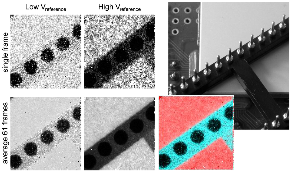 Recorded 92 × 90 pixel images of the object shown at the top right (a DIL socket on top of the scintillator glued in the QX2010). Top left/middle: simultaneous low reference and high reference threshold images from the QX2010. Bottom left/middle: the same, averaged 61 frames to smooth the photon shot noise. Color image: A “color-matrixed” combination of the two bottom left/middle images.