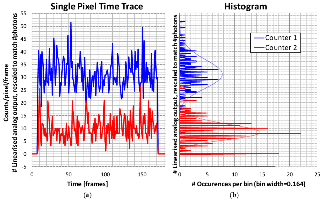 One pixel, two thresholds, observed over a time comprising 180 frames. Beam powers on at frame 9 and powers off after frame 170. (a) Counts versus frame number; (b) Horizontal histogram of the occurrences of analog count values. Thin red and blue lines are theoretical Poisson distributions with the same average counts.