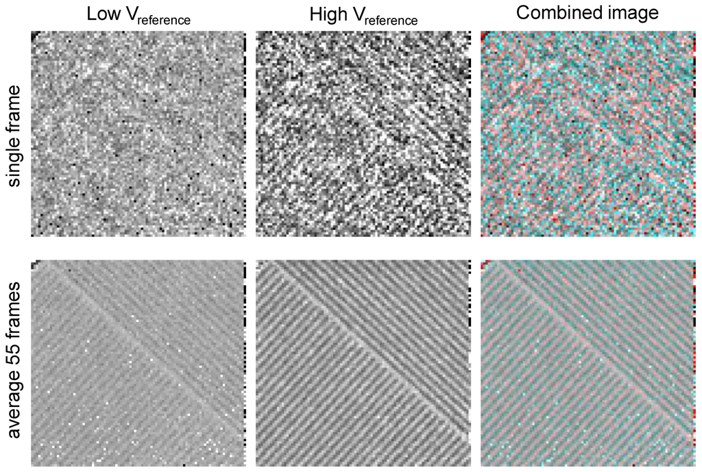 Images of a lead resolution target. Simultaneously recorded frames with two threshold levels (left, middle). Right: “color matrix-like” linear combination of the two frames for color rendering. Upper row: single frames; lower row: average of 55 frames.
