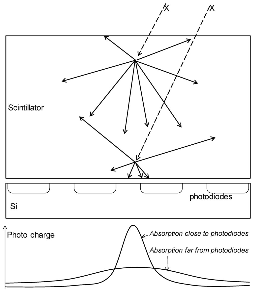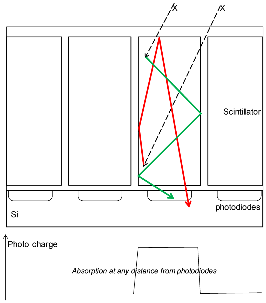 In these experiments, we demonstrated that scintillator-based photon counting is feasible. At the same time, however, we were able to pinpoint the major shortcomings of scintillator-based photon counting, all related to the well-known scintillator depth effect or to Lubbert’s effect [19]: the amount of secondary radiation that falls on a single Silicon pixel depends significantly on the depth in the scintillator where the photo-electric conversion from X-ray photo to secondary light flash takes place, as illustrated in Figure 14.