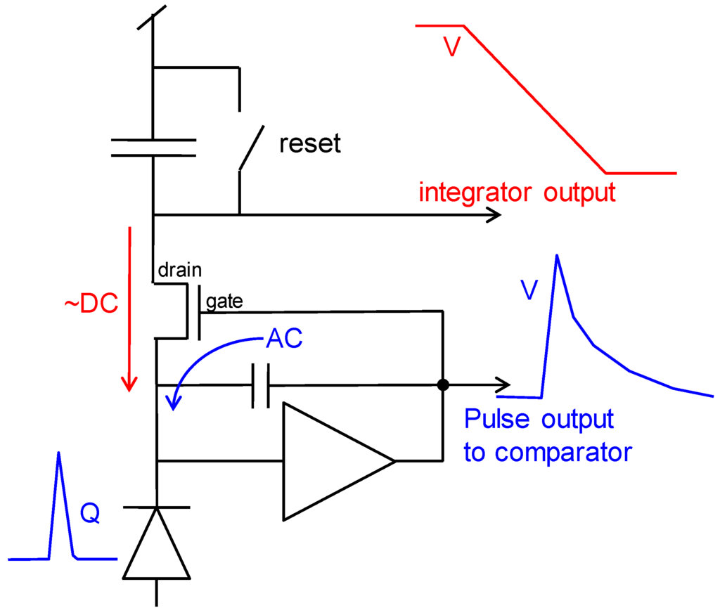 Concept circuit of a pulse shaper that feeds its photocurrent to a charge integrator.