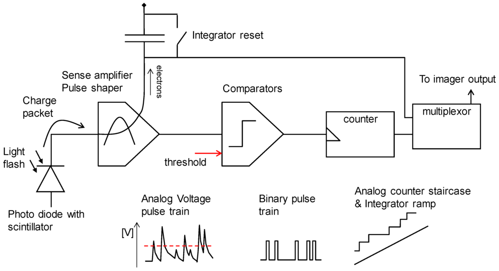 Our experimental device “QX2010” (Figure 1 and Table 1) is an image sensor with an array of X-ray photon counting pixels based on indirect (i.e., using a scintillator) X-ray detection. Pixels are capable of detecting charge packets of at least 100 electrons per X-photon. This requirement stems from practice: this is the amount of charge carriers collected by the visible light photodiode for a single event, for photon energies in the range of medical X-ray, i.e., 20 to 100 keV, using typical scintillator materials and scintillator thicknesses for medical X-ray imaging.